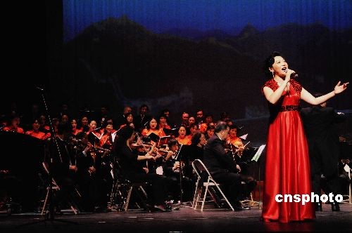 華盛頓黃河藝術(shù)團(tuán)藝術(shù)家在當(dāng)?shù)貢r(shí)間十月二十五日晚的演出中用中國(guó)改革開(kāi)放歷程中涌現(xiàn)的歌曲,抒發(fā)中國(guó)人共同經(jīng)歷的改革開(kāi)放不平凡的三十年,引起了海外華人強(qiáng)烈共鳴。圖為黃河藝術(shù)團(tuán)藝術(shù)家演唱《好一個(gè)中國(guó)大舞臺(tái)》贏得雷鳴掌聲。中新社發(fā) 邱江波 攝