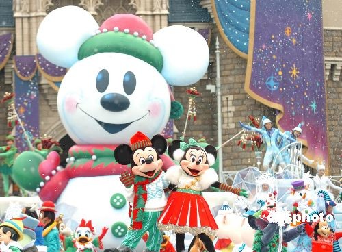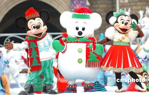 11月7日,東京迪斯尼為迎接2008年圣誕推出了新的卡通形象“雪米奇”。數(shù)萬游客從四面八方趕至爭(zhēng)相一睹這個(gè)漂亮善良的新朋友。圖為在歌舞表演中的米奇、米妮與雪米奇。中新社發(fā) 朱沿華 攝