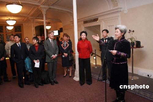 當?shù)貢r間8日晚,內(nèi)蒙古民族歌舞劇院蒙古族青年合唱團在倫敦卡杜甘音樂廳(Cadogan Hall)進行無伴奏合唱演出。圖為演出前的招待會上,蒙古族的中國駐英大使傅瑩(右一)換上民族服裝,在致辭中歡迎來自家鄉(xiāng)的合唱團的演出。中新社發(fā) 李鵬 攝