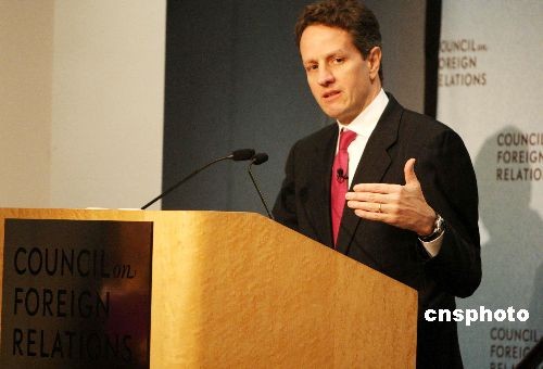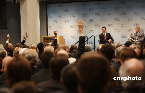 25日,美國(guó)財(cái)政部長(zhǎng)蓋特納在位于紐約的美國(guó)外交關(guān)系協(xié)會(huì)(CFR)發(fā)表演講時(shí)表示對(duì)美元很有信心,“美元的基礎(chǔ)地位應(yīng)該不會(huì)改變”。蓋特納同時(shí)表示,政府應(yīng)該對(duì)金融公司有更大的控制權(quán)。圖為蓋特納接受美國(guó)外交關(guān)系協(xié)會(huì)會(huì)員提問。中新社發(fā) 魏晞 攝