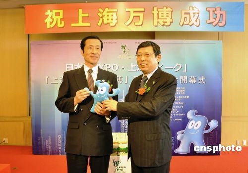 4月13日下午,日本“上海世博推介周”中的重要環(huán)節(jié)——“上海與上海世博會(huì)”圖片展,在東京羽田機(jī)場(chǎng)開幕。圖片展將持續(xù)到本月底,計(jì)劃在羽田機(jī)場(chǎng)、京濱急行列車“世博號(hào)”以及其他東京地鐵列車和站臺(tái)上展出反映上海城市風(fēng)情、市民生活、世博籌備等各方面的圖片共700幅,以讓日本市民直觀、生動(dòng)地了解上海與上海世博會(huì)的最新情況。圖為上海世博會(huì)執(zhí)委會(huì)常務(wù)副主任、上海市常務(wù)副市長(zhǎng)楊雄(右),向東京都副知事菅原秀夫贈(zèng)送上海世博會(huì)吉祥物海寶。中新社發(fā) 關(guān)妍 攝