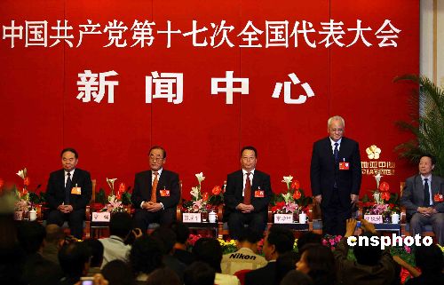 中共十七大新聞中心10月18日晚邀請五位中共黨員部長聯(lián)合接受記者采訪。從左至右依次為教育部部長周濟、衛(wèi)生部常務(wù)副部長高強、勞動和社會保障部部長田成平、民政部部長李學(xué)舉和建設(shè)部副部長仇保興。中新社發(fā) 任晨鳴 攝