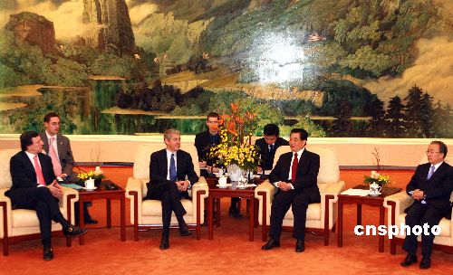 十一月二十八日,北京人民大會堂,中國國家主席胡錦濤會見歐盟輪值主席國葡萄牙總理蘇格拉底與歐盟委員會主席巴羅佐。他們是前來參加第四屆中歐工商峰會的。中新社發(fā) 廖文靜 攝