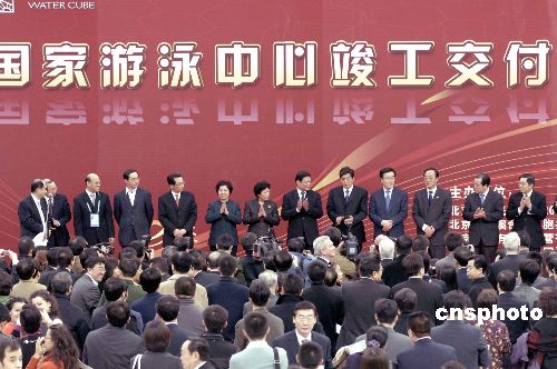 1月28日,作為北京奧運(yùn)會(huì)標(biāo)志性場館的國家游泳中心(“水立方”)宣布竣工。北京市委書記劉淇、市長郭金龍等出席竣工儀式。這個(gè)歷時(shí)4年多時(shí)間建成的水藍(lán)色建筑即將投入“好運(yùn)北京”賽事使用。中新社發(fā) 徐曦弋 攝