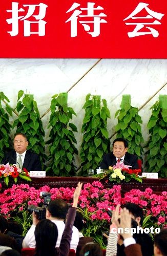 3月11日,十一屆全國(guó)人大一次會(huì)議新聞發(fā)布會(huì)在北京人民大會(huì)堂舉行。國(guó)家發(fā)展和改革委員會(huì)副主任解振華(左)、國(guó)家環(huán)境保護(hù)總局副局長(zhǎng)張力軍,就環(huán)境資源、節(jié)能減排、2008奧運(yùn)期間北京空氣質(zhì)量等問(wèn)題回答記者提問(wèn)。中新社發(fā) 王東明 攝