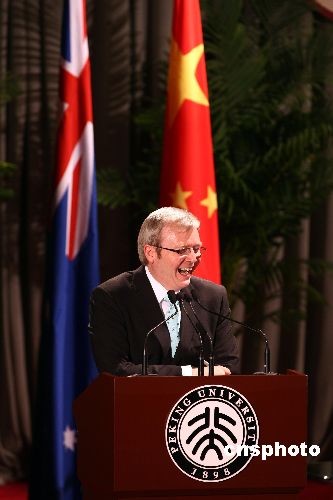 4月9日,澳大利亞總理陸克文在北京大學用中文發(fā)表演講。中新社發(fā) 盛佳鵬 攝