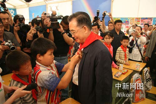 五月二十三日,正在四川地震災(zāi)區(qū)考察的國(guó)務(wù)院總理溫家寶來(lái)到綿陽(yáng)九洲體育館,看望九洲帳篷學(xué)校的孩子們。圖為孩子們?yōu)闇丶覍毾瞪霞t領(lǐng)巾。中新社發(fā) 齊彬攝