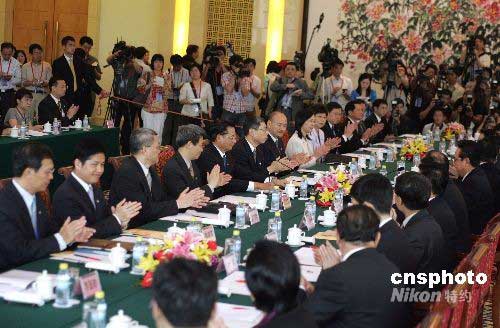 6月12日上午,海峽兩岸關(guān)系協(xié)會(huì)新任會(huì)長(zhǎng)陳云林與臺(tái)灣海峽交流基金會(huì)董事長(zhǎng)江丙坤在北京釣魚臺(tái)五號(hào)樓舉行會(huì)談。陳云林致詞后,與會(huì)雙方報(bào)以熱烈掌聲。中新社發(fā) 任晨鳴 攝