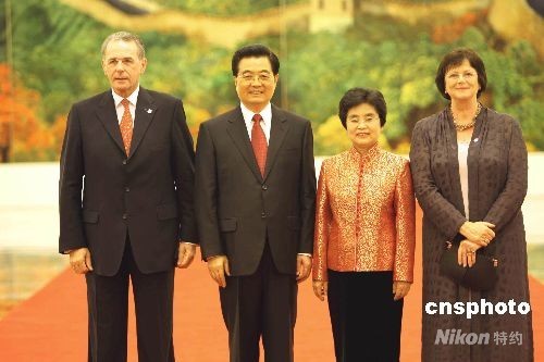 8月8日中午,中國(guó)國(guó)家主席胡錦濤和夫人劉永清在北京人民大會(huì)堂為出席北京奧運(yùn)會(huì)的貴賓舉行歡迎宴會(huì)。圖為胡錦濤夫婦歡迎國(guó)際奧委會(huì)主席羅格。中新社發(fā) 任海霞 攝