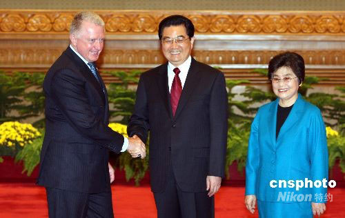 9月6日,國(guó)家主席胡錦濤夫婦在北京人民大會(huì)堂歡迎出席2008年殘奧會(huì)的各國(guó)貴賓。圖為胡錦濤夫婦歡迎第29屆奧運(yùn)會(huì)協(xié)調(diào)委員會(huì)主席維爾布魯根。中新社發(fā) 任海霞 攝