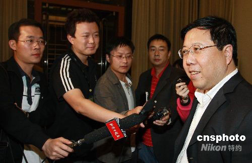 “長征二號F”運載火箭總設(shè)計師荊木春在機場接待廳被記者追蹤采訪。