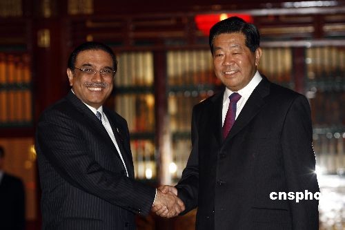 10月16日,中國(guó)全國(guó)政協(xié)主席賈慶林在北京釣魚(yú)臺(tái)國(guó)賓館會(huì)見(jiàn)巴基斯坦總統(tǒng)扎爾達(dá)里。中新社發(fā) 盛佳鵬 攝