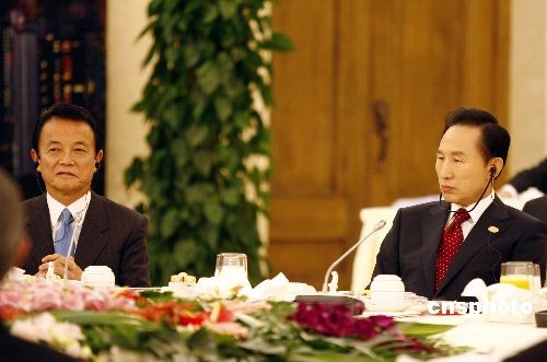 10月24日,東盟與中日韓領(lǐng)導人早餐會在北京人民大會堂舉行,出席第7屆亞歐首腦會議的東盟10國和中國、日本、韓國領(lǐng)導人出席,中國國務院總理溫家寶主持早餐會。圖為日本首相麻生太郎、韓國總統(tǒng)李明博出席東盟和中日韓領(lǐng)導人早餐會。中新社發(fā) 盛佳鵬 攝