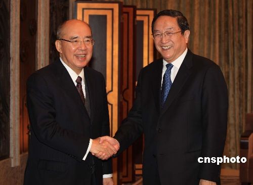 12月20日,中共上海市委書記俞正聲在上海西郊賓館會見中國國民黨主席吳伯雄一行。俞正聲在會見時表示,希望吳主席盡早幫助推動、促進上海世博會“臺灣館”的籌建。中新社發(fā) 潘索菲 攝