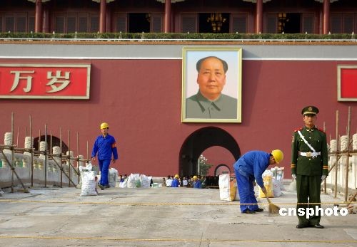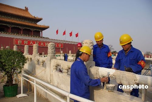 3月19日,施工人員在北京天安門金水橋上施工修理。據(jù)悉,預(yù)計天安門金水橋全面修繕工作將于5月1日前完成,并整體向游客開放。中新社發(fā) 九州 攝