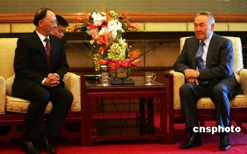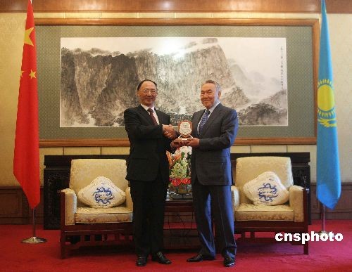 4月16日,中國國家體育總局局長(zhǎng)、中國奧委會(huì)主席劉鵬在北京釣魚臺(tái)國賓館會(huì)見哈薩克斯坦總統(tǒng)納扎爾巴耶夫,并向納扎爾巴耶夫總統(tǒng)頒發(fā)中國奧委會(huì)勛章,以表示其對(duì)中國體育事業(yè)的支持。納扎爾巴耶夫此行是應(yīng)中國國家主席胡錦濤邀請(qǐng),于15日傍晚抵達(dá)北京,開始對(duì)中國進(jìn)行為期5天的國事訪問。訪華期間,納扎爾巴耶夫?qū)⑴c中國國家主席胡錦濤、全國人大常委會(huì)委員長(zhǎng)吳邦國和國務(wù)院總理溫家寶進(jìn)行會(huì)見,他還將出席博鰲亞洲論壇2009年年會(huì),這是納扎爾巴耶夫2005年連任總統(tǒng)以來第2次對(duì)中國進(jìn)行國事訪問。中新社發(fā) 富田 攝
