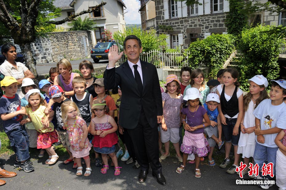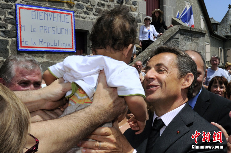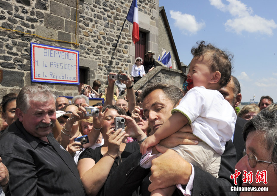 當(dāng)?shù)貢r間7月1日,法國總統(tǒng)薩科齊來到法中部城鎮(zhèn)Mur-de-Barrez視察,與當(dāng)?shù)孛癖娏憔嚯x接觸.他從民眾手中抱起一個叼著奶嘴的小嬰兒,不知是何原因,小寶貝竟然大哭起來。