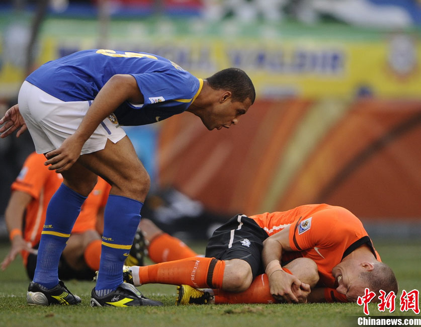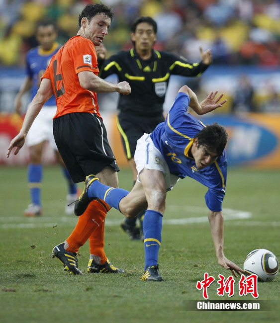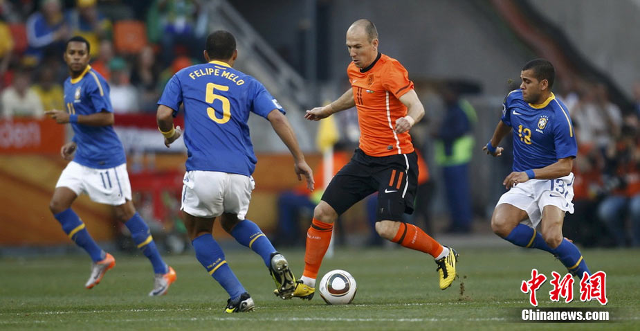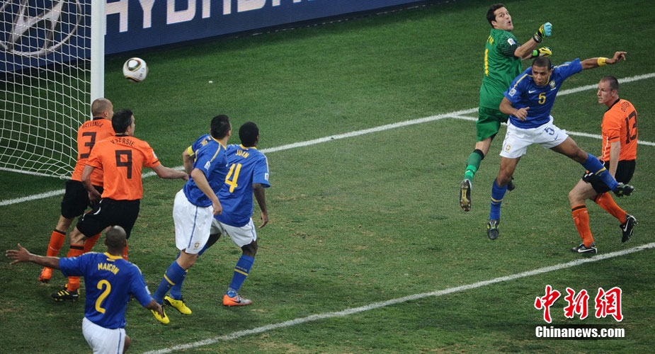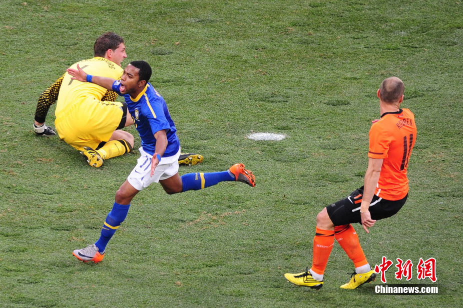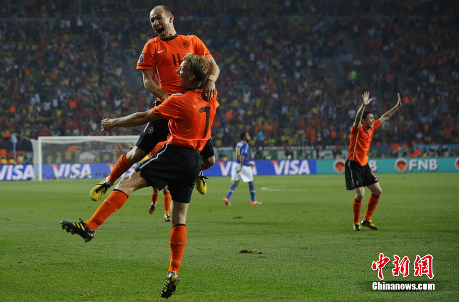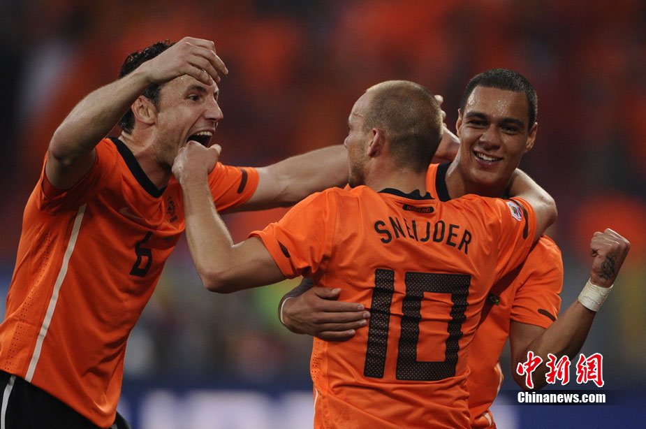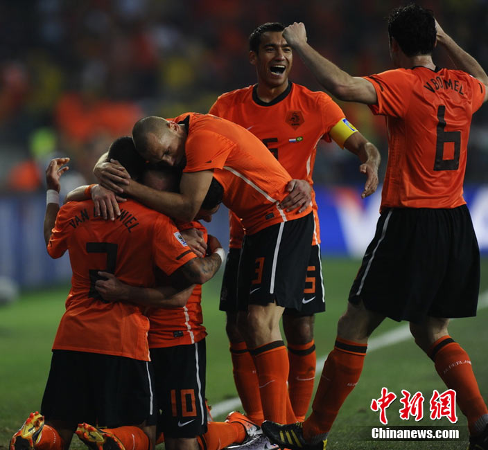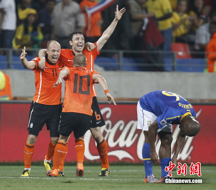 7月2日晚,南非世界杯進(jìn)行了1/4決賽的首場(chǎng)比賽,由荷蘭隊(duì)迎戰(zhàn)巴西。雖然羅比尼奧在上半場(chǎng)率先破門,但下半場(chǎng)憑借胡安的烏龍球和斯內(nèi)德頭槌建功,荷蘭隊(duì)2-1逆轉(zhuǎn)擊敗巴西隊(duì),率先挺進(jìn)四強(qiáng)。