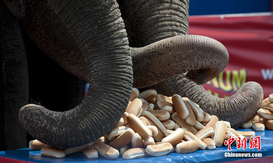 當(dāng)?shù)貢r(shí)間7月2日,在美國(guó)紐約的科尼島,一支由三只大象組成的“隊(duì)伍”和三位大胃王進(jìn)行了一次吃面包PK。最終大象隊(duì)獲得了勝利。