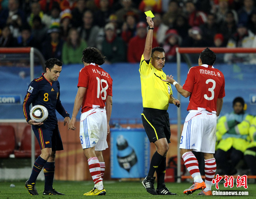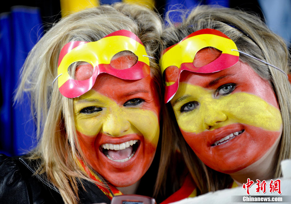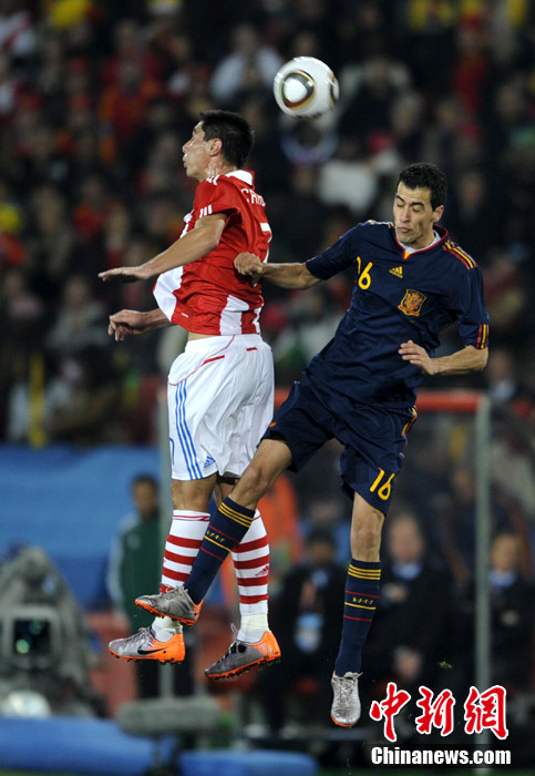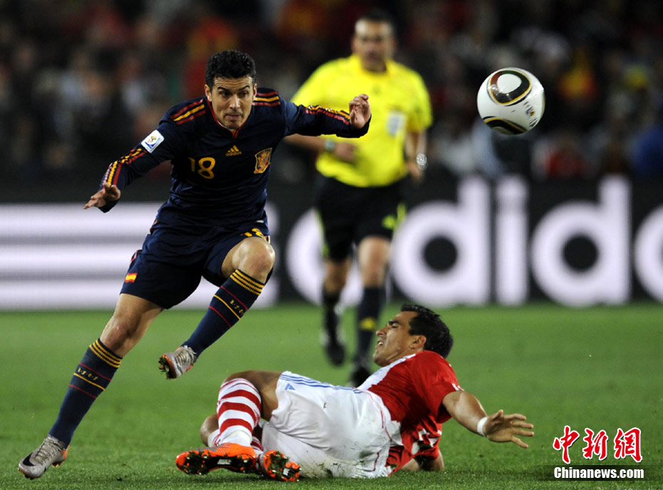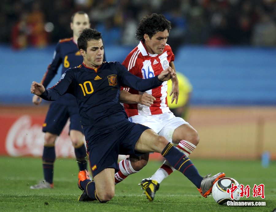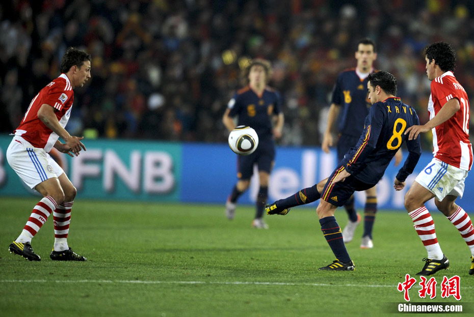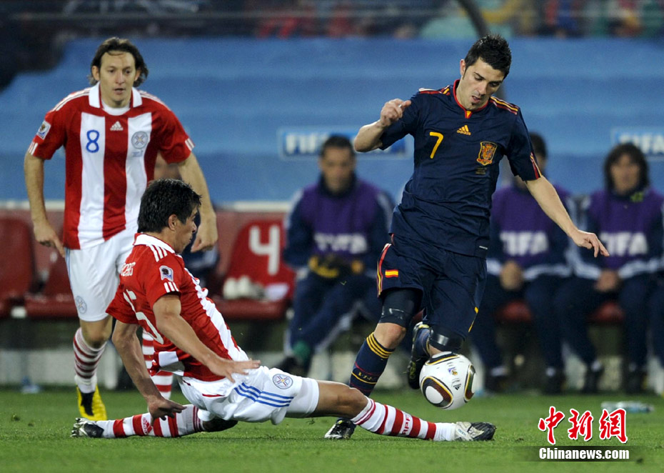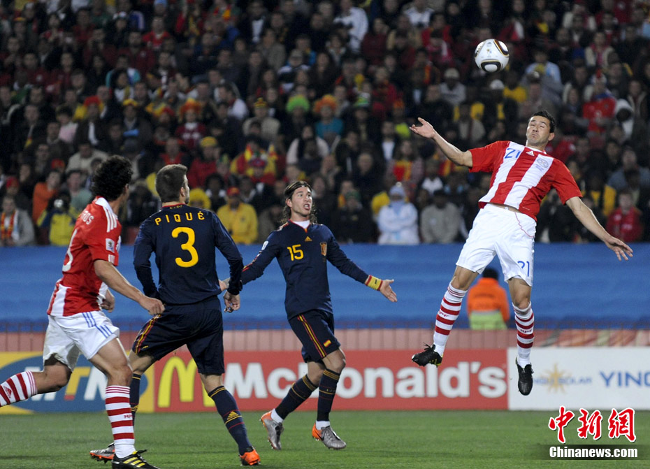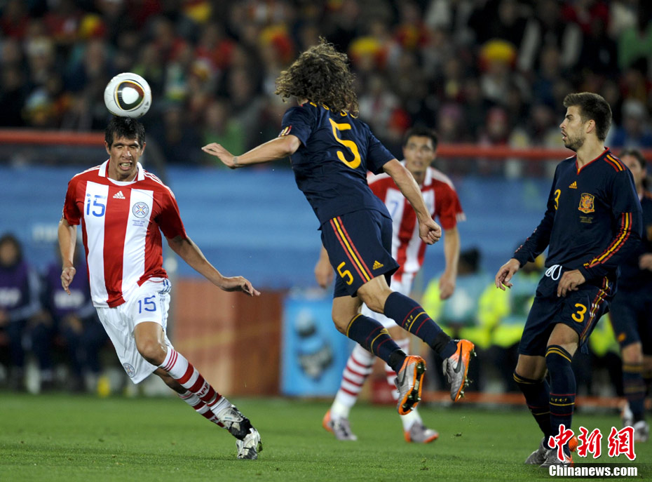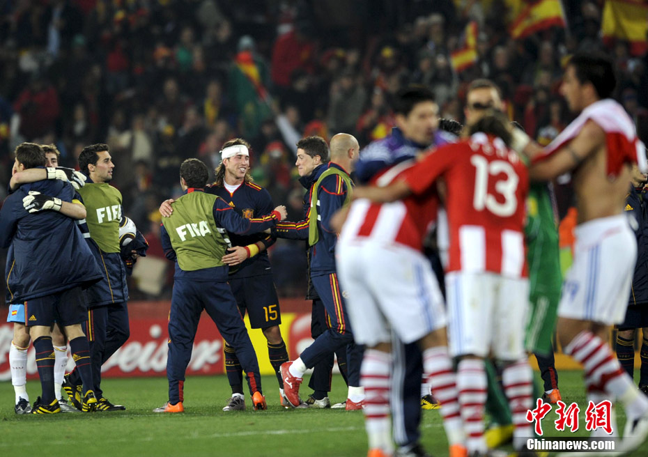7月4日凌晨,南非世界杯最后一場(chǎng)1/4決賽打響,西班牙在約翰內(nèi)斯堡的愛麗絲公園球場(chǎng)迎來(lái)了南美勁旅巴拉圭隊(duì)。憑借比利亞在第83分鐘的進(jìn)球,西班牙1-0擊敗巴拉圭,晉級(jí)四強(qiáng)。中新社記者 廖攀 攝