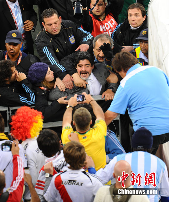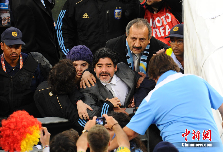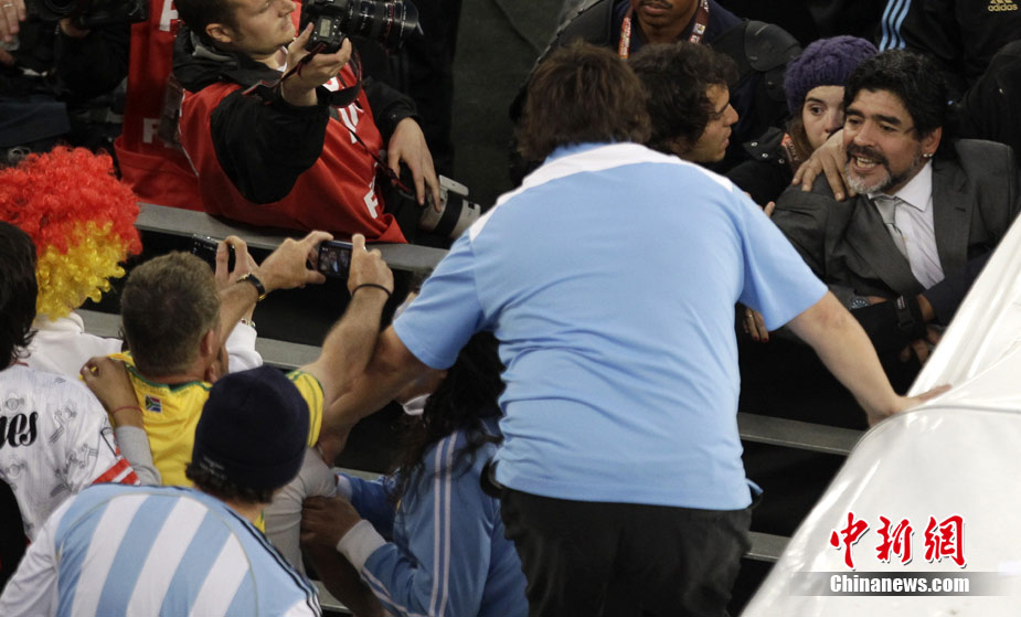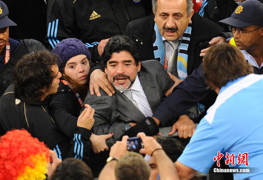 南非世界杯阿根廷與德國隊(duì)的比賽結(jié)束后,瘋狂的德國球迷對馬拉多納進(jìn)行了辱罵和奚落,急脾氣的老馬轉(zhuǎn)身沖向看臺與球迷理論,他更是要爬上看臺親手教訓(xùn)這些球迷。好在大女兒達(dá)爾瑪和阿根廷教練組成員及時(shí)前往制止,否則后果將不堪設(shè)想。