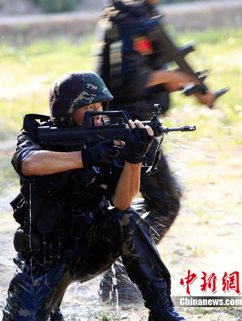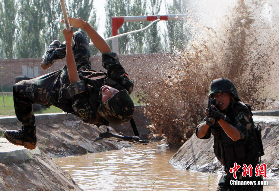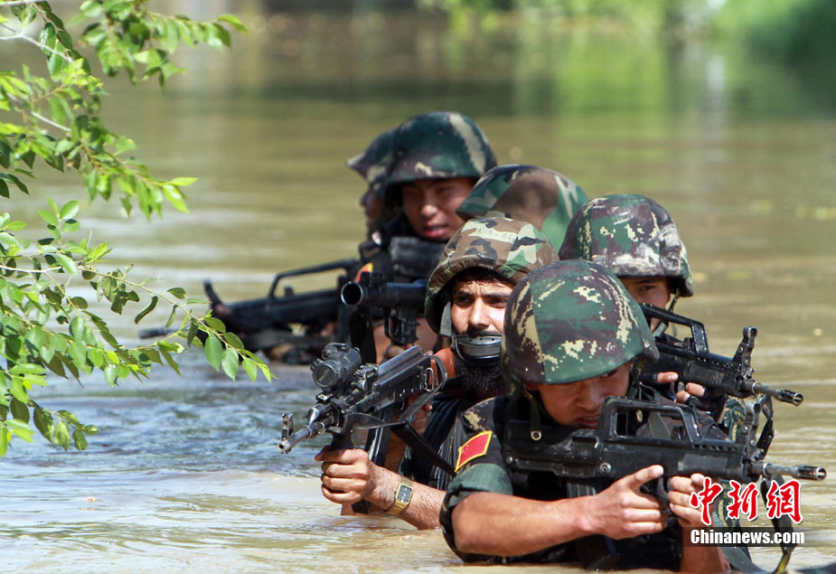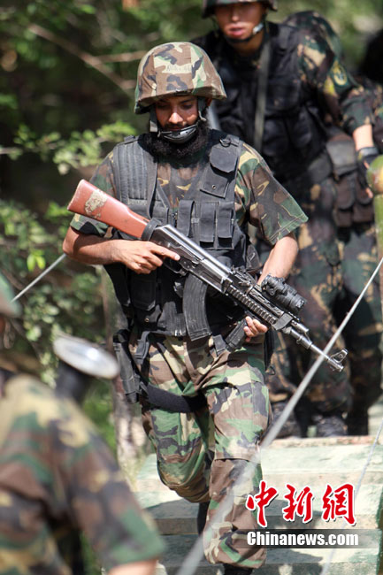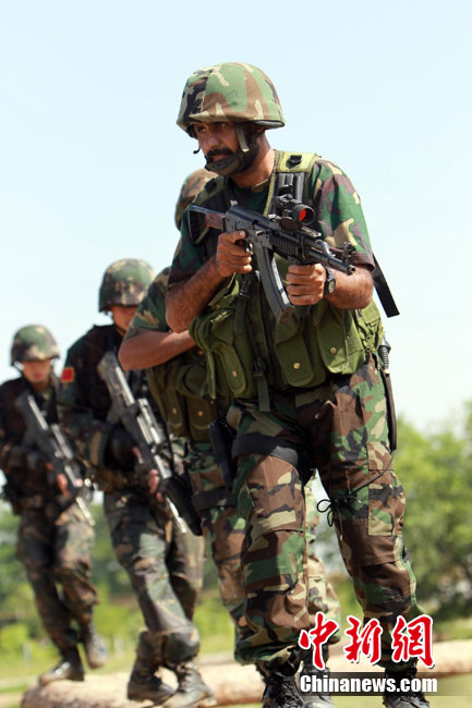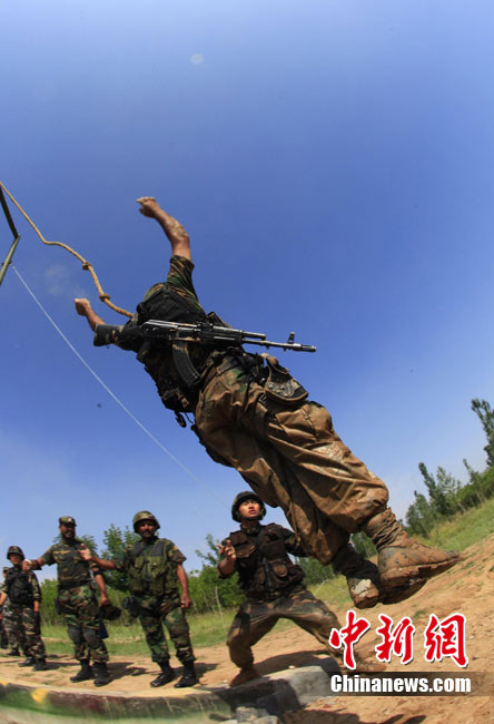 7月5日,中巴兩軍特戰(zhàn)士兵展開高強(qiáng)度魔鬼訓(xùn)練。此次代號為“友誼—2010”的中國巴基斯坦反恐聯(lián)合訓(xùn)練在中國寧夏青銅峽地區(qū)展開,訓(xùn)練主要以邊境地區(qū)山地聯(lián)合反恐作戰(zhàn)為課題,分為展示交流、混編同訓(xùn)、綜合演練三個階段。 中新社發(fā) 杜洋 攝