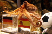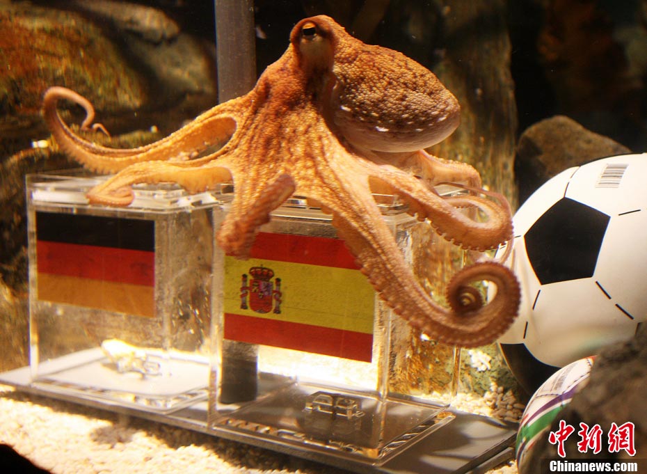 7月6日下午,德國某水族館的章魚保羅再次出動,對世界杯半決賽德國與西班牙進行了預測,最終他選擇了西班牙。保羅認為歐洲冠軍西班牙將在半決賽擊敗勢頭強勁的德國隊進入決賽!秷D片報》網(wǎng)站的直播員在公布結果的同時說道:“希望勒夫的小伙子們能扭轉局勢,拯救這場半決賽!被蛟S,對于德國球迷來說還有一個自我安慰的理由:保羅在2008年歐錦賽上預測的準確率是80%,并且唯一錯的就是決賽與西班牙之戰(zhàn)。他們或許已經(jīng)開始期待:兩年后的世界杯預測不要百發(fā)百中,至少在半決賽時錯一次。