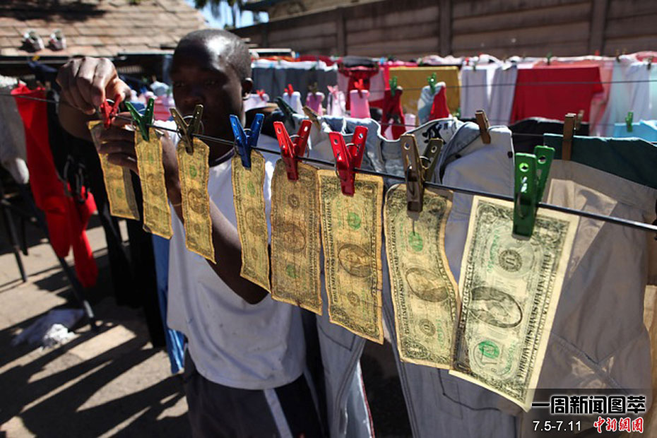 7月6日周二,津巴布韋哈拉雷,阿萊克斯•姆龐迪晾曬清洗過(guò)的美鈔。據(jù)當(dāng)?shù)厝苏f(shuō),這些美鈔流通到本國(guó)時(shí)因異味太濃無(wú)法使用。去年津巴布韋政府宣布美元為法定貨幣。