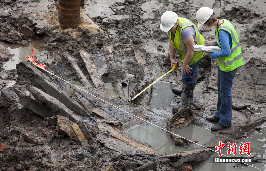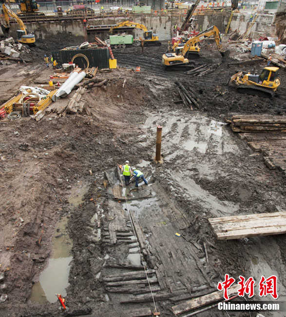 近日,美國紐約世貿(mào)中心遺址發(fā)現(xiàn)了一艘據(jù)信是18世紀的古船殘骸。報道稱,正在當?shù)匦藿ㄐ率蕾Q(mào)大樓的建筑工人意外發(fā)現(xiàn)了這艘古船?脊艑W家表示,這艘長約32英尺的古船可能是當年用來運料填充哈德遜河。