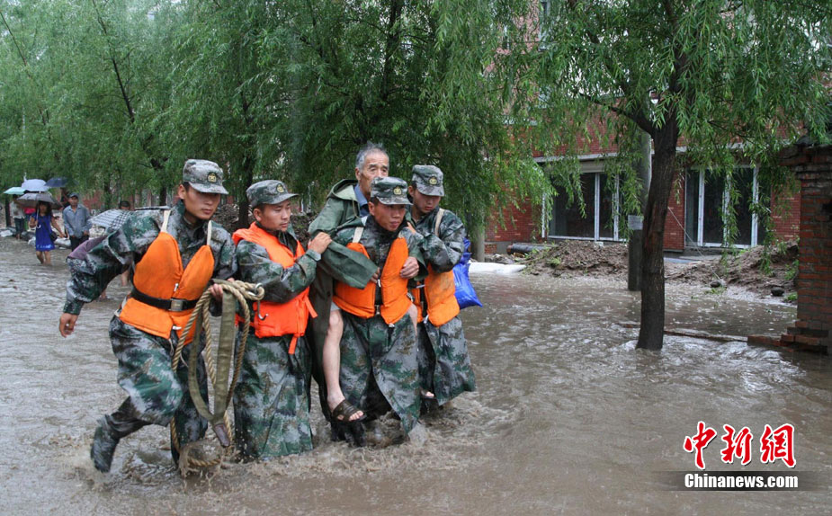 28日以來的一場暴雨讓吉林省多個地區(qū)遭遇罕見洪災(zāi),此后對災(zāi)區(qū)的救援緊張進行。目前在永吉縣口前鎮(zhèn),已有部分商戶恢復(fù)營業(yè)。圖為在重災(zāi)區(qū)永吉縣,士兵將一名老婦轉(zhuǎn)移到安全地帶。中新社記者 張杰 攝