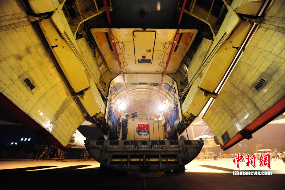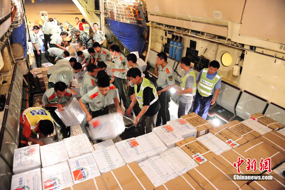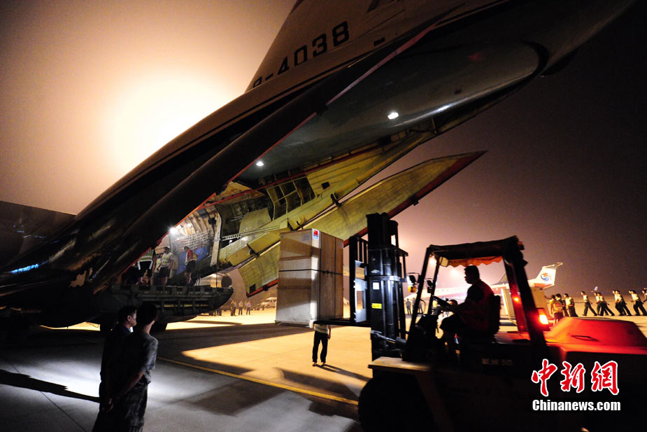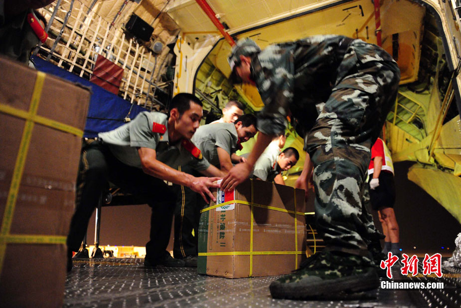 8月3日深夜,中國(guó)政府緊急援助巴基斯坦人道主義物資在河北省石家莊機(jī)場(chǎng)連夜裝機(jī),準(zhǔn)備于4日通過中國(guó)空軍飛機(jī)運(yùn)往伊斯蘭堡。這批物資包括30噸藥品和凈水設(shè)備、1000頂帳篷、50臺(tái)發(fā)電機(jī)等,總價(jià)值約1000萬元人民幣。 中新社發(fā) 侯宇 攝