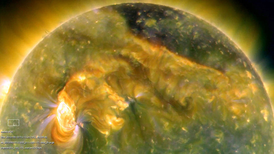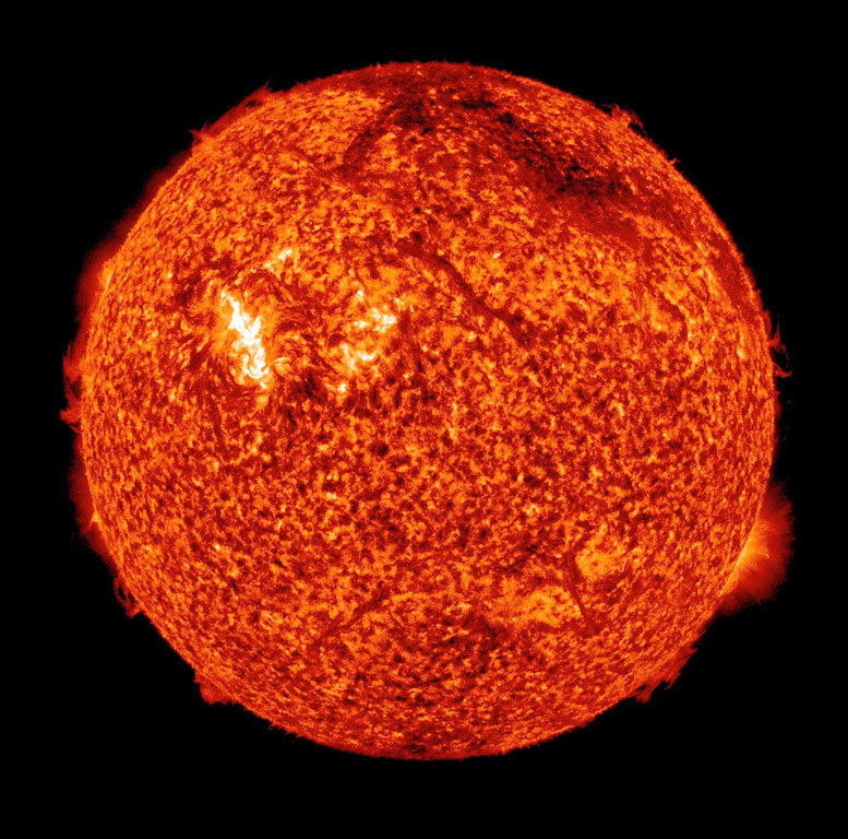 據(jù)英國媒體2日報道,各國天文臺近日觀測到太陽表面發(fā)生劇烈的太陽風(fēng)暴,科學(xué)家預(yù)測,攜帶大量帶電粒子的太陽風(fēng)預(yù)計于4日抵達地球,在兩極產(chǎn)生強烈的極光現(xiàn)象。圖為8月3日,NASA公布了太陽動力學(xué)觀測衛(wèi)星(SDO)1日通過極紫外線相機拍攝到的太陽北半球耀斑爆發(fā),耀斑下的太陽黑子足有地球大小。(NASA圖)