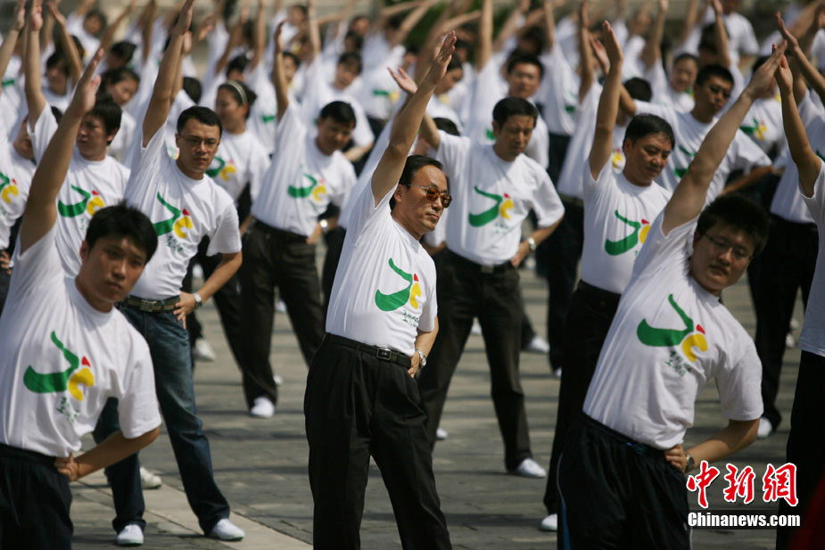 8月10日,北京50余個基層單位和表演團體的近3000余名職工工間操小教員在北京市勞動人民文化宮太廟前與副市長、體育明星和勞模們一起做“第八套廣播體操”。當日,2010首都職工示范推廣工間操宣傳周啟動。中新社發(fā) 蘇丹 攝