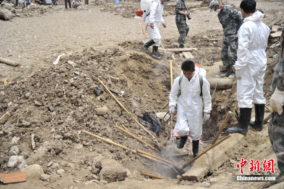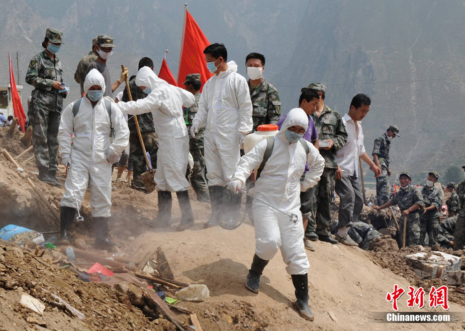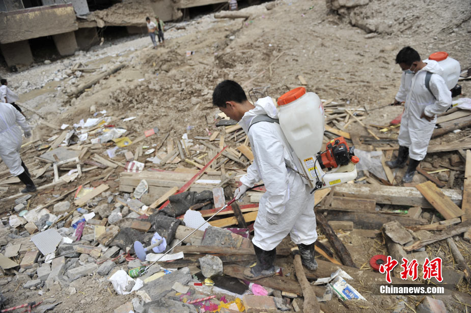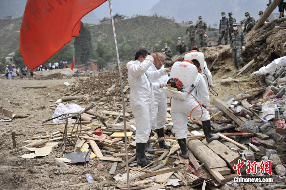8月10日,甘肅舟曲泥石流災區(qū)氣溫超過35攝氏度,醫(yī)療隊人員在救援現場噴灑消毒劑進行防疫消毒。中新網記者 金碩 攝