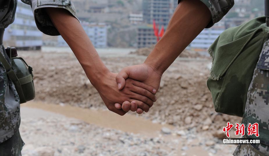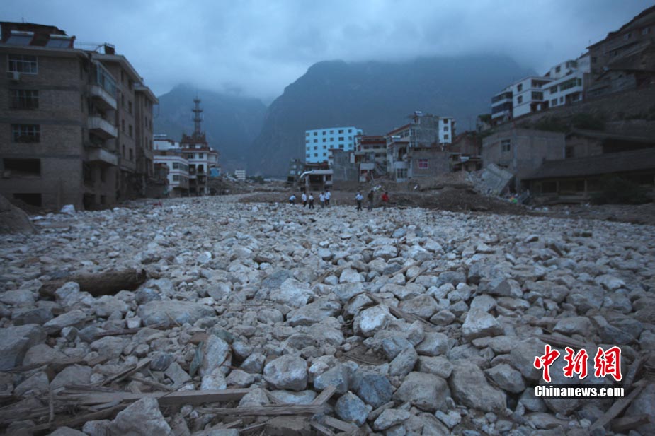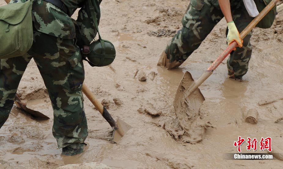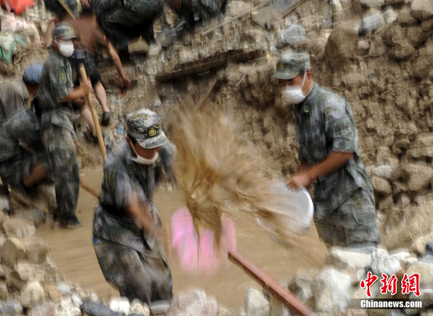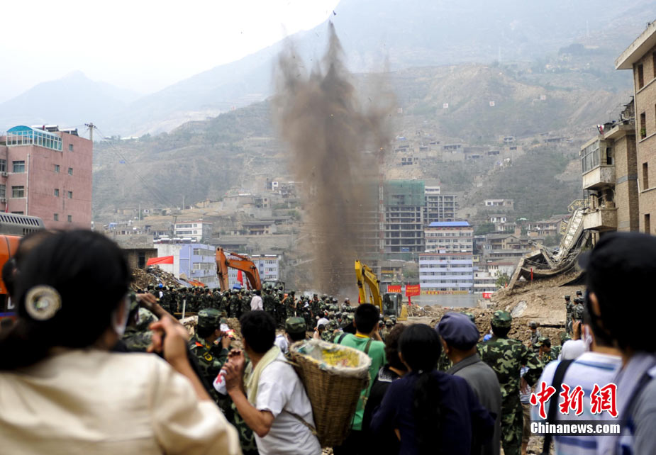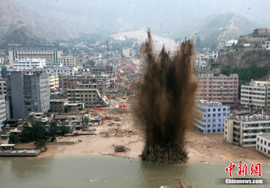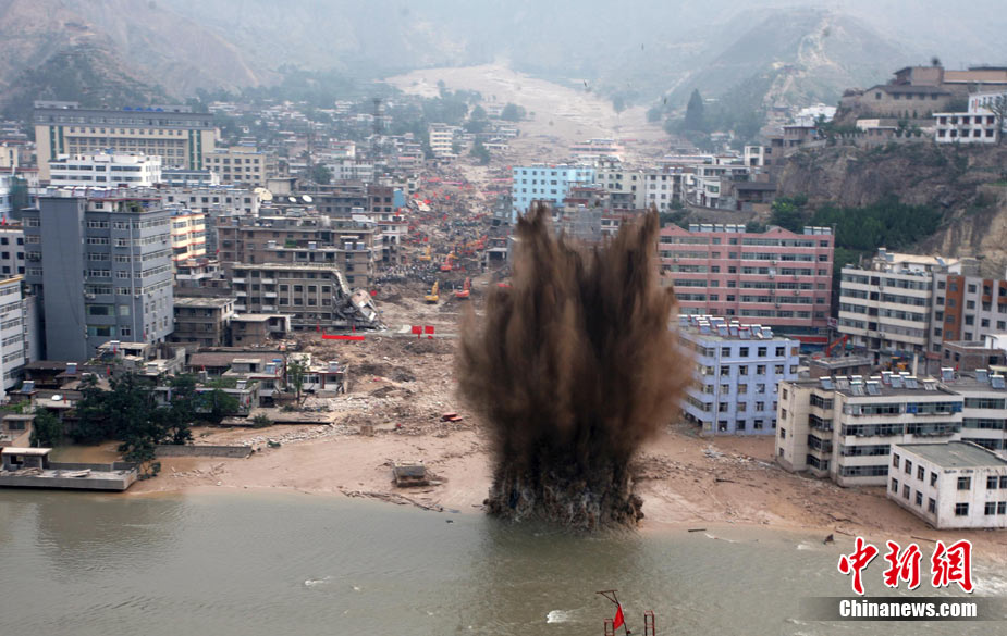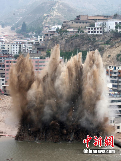 8月11日上午9時(shí)40分,蘭州軍區(qū)某集團(tuán)軍“開山斧工兵團(tuán)”對(duì)舟曲堰塞湖堰塞體成功實(shí)施第12次爆破。爆破后河道明顯出現(xiàn)斜坡,江水下泄速度明顯加快。圖為堰塞體12次爆破現(xiàn)場。中新社發(fā) 劉忠俊 攝