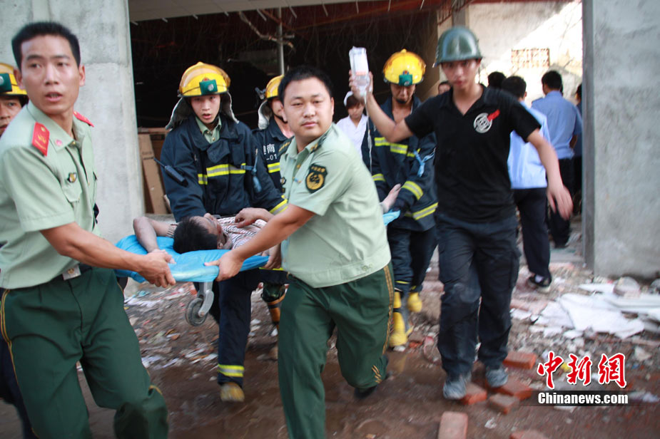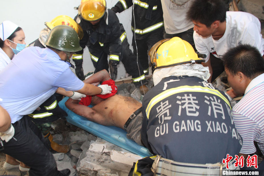 8月13日早晨,廣西貴港市橋圩鎮(zhèn)供銷社百貨門市部一棟3層的樓房突然倒塌,造成12名住戶被埋廢墟中。至上午10時(shí)50分,已知被埋人員被消防官兵全部救出,事故造成3人死亡9人受傷。中新社發(fā) 楊文福 攝