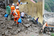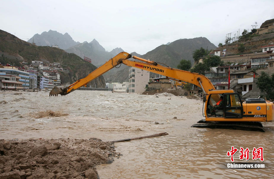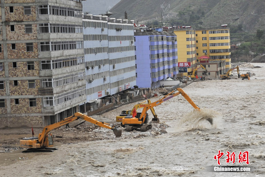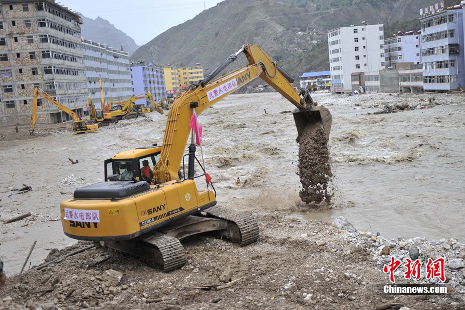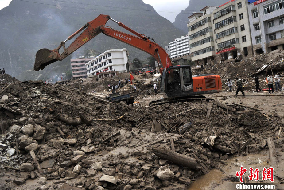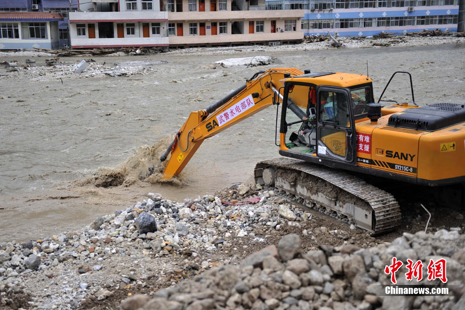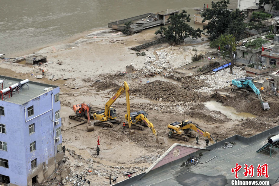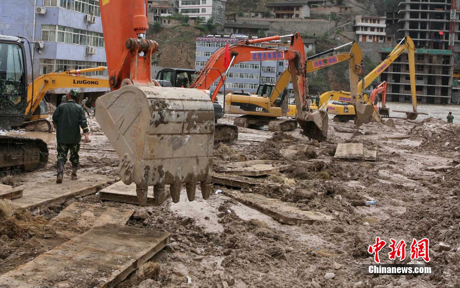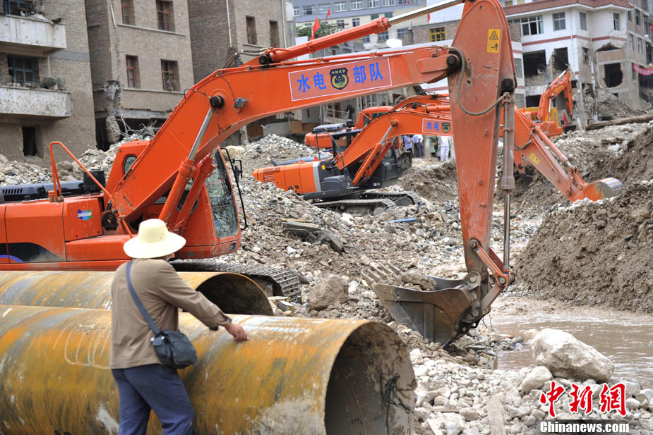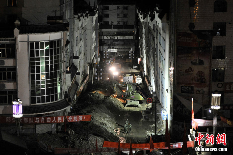 8月14日,舟曲災(zāi)區(qū)救援官兵晝夜展開清淤工作。截至當日,影響大型機械進入舟曲重災(zāi)區(qū)的部分街道已經(jīng)暢通。蘭州軍區(qū)某集團軍工兵團從13日晚上9點到14日上午9點,出動80人、3臺挖掘機、4臺裝載機、21臺裝卸車,在舟曲縣城南街清理廢墟。經(jīng)過一晚奮戰(zhàn),清理淤泥200立方米,街道已基本暢通。中新網(wǎng)記者 金碩 攝
