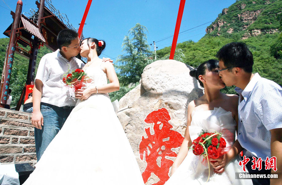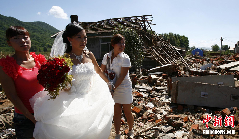 8月16日,吉林市前二道鄉(xiāng)“災(zāi)區(qū)新娘”劉旭穎在藍(lán)色的救災(zāi)帳篷里出嫁。27歲的劉旭穎本應(yīng)在7月30日結(jié)婚,然而7月28日凌晨的一場(chǎng)罕見(jiàn)洪水將她家所在的村莊變成一片廢墟,也沖走了準(zhǔn)新娘的婚禮。為了圓自己一個(gè)心愿,也為了讓災(zāi)區(qū)人看到生活的希望,劉旭穎決定辦一場(chǎng)特別的災(zāi)區(qū)婚禮。中新社發(fā) 蒼雁 攝