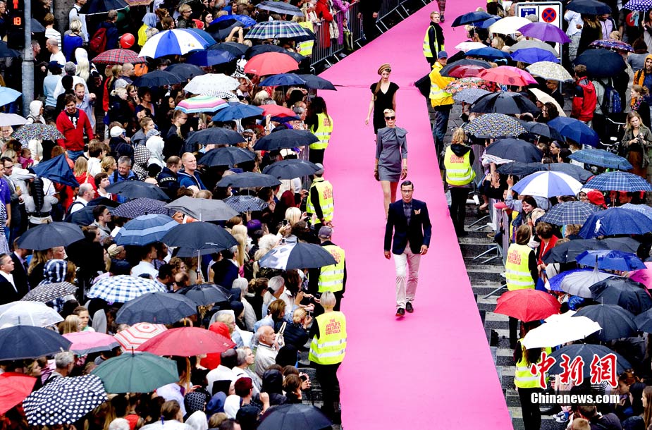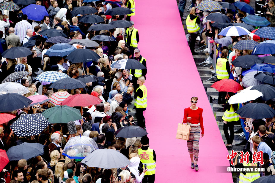近日,為迎接哥本哈根時(shí)裝周,哥本哈根時(shí)裝協(xié)會(huì)專門在市中心建起了一條一英里長(zhǎng)(1.61公里)的粉紅色T臺(tái),成功打破“最長(zhǎng)T臺(tái)”的世界紀(jì)錄。超過(guò)10萬(wàn)名觀眾聚集在T臺(tái)旁欣賞時(shí)裝秀。