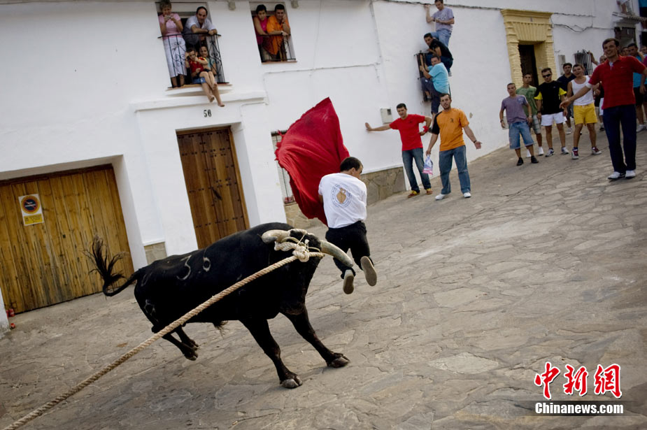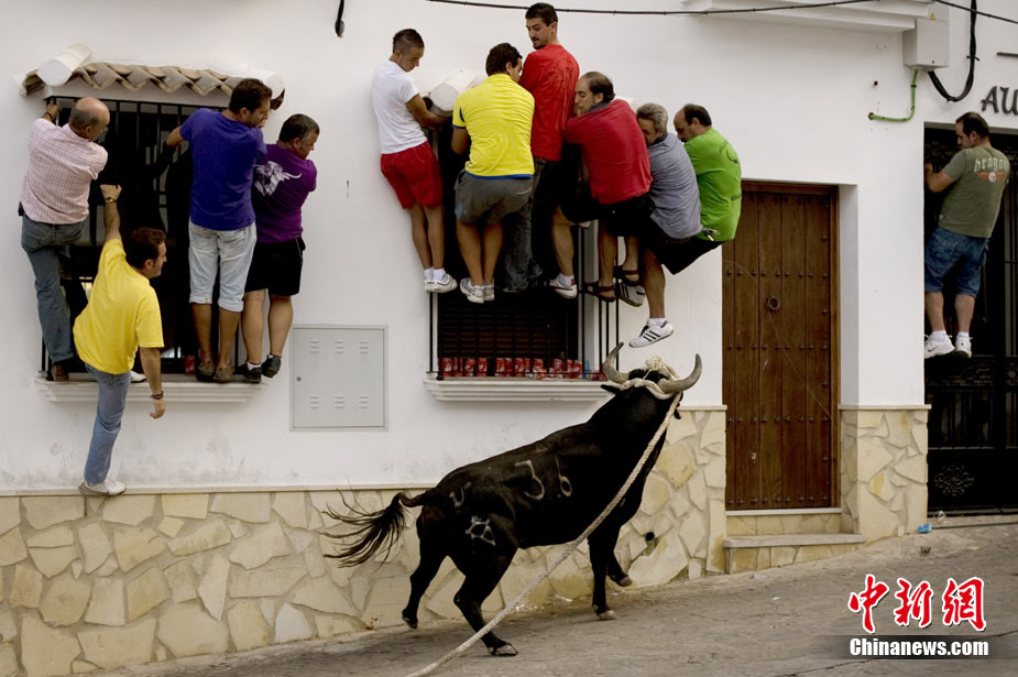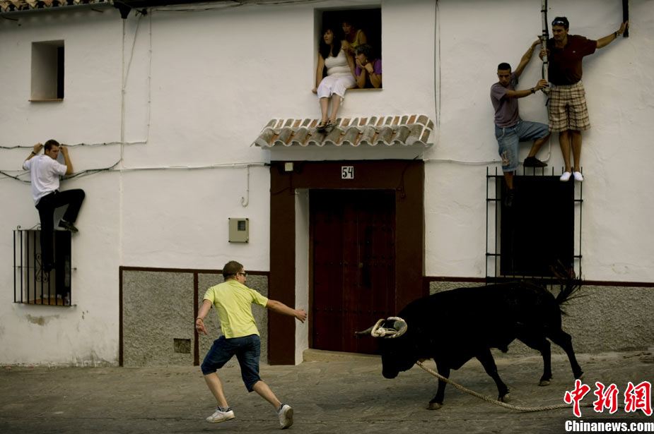 近日,西班牙羅薩里奧一個小城的居民在村中街道上玩起了斗牛。勇敢的年輕人一邊挑釁憤怒的公牛,一邊紛紛跳上房屋躲避。上演了一場街頭斗牛。