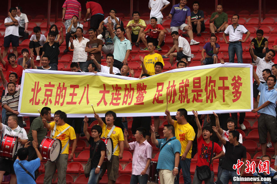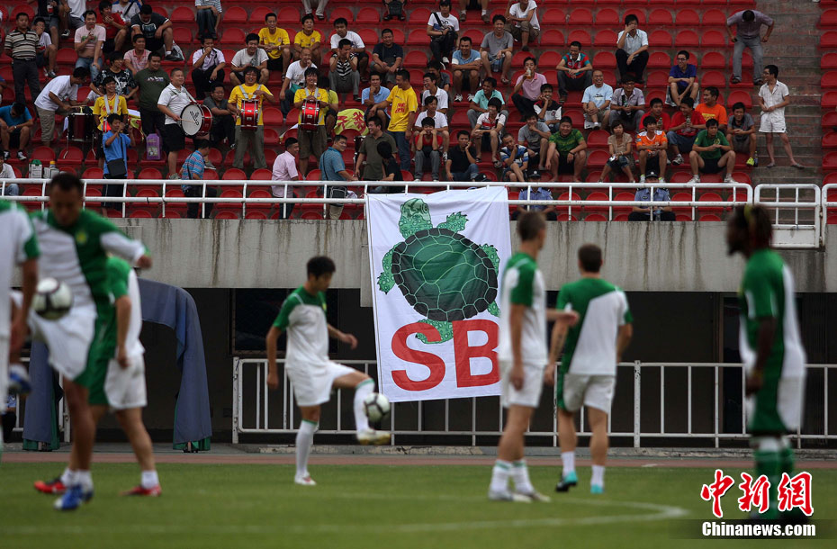 2010年8月17日,西安,北京國安隊在陜西省體育場備戰(zhàn)中超聯(lián)賽第19輪和陜西隊的客場比賽。陜西球迷“組團”來到現(xiàn)場,用持續(xù)不斷的罵聲干擾國安隊戰(zhàn)前的踩場訓練,球迷們還打出了“綠烏龜”的畫幅和各種標語暗諷國安。中新社發(fā) 梁萌 攝 圖片來源:CNSPHOTO