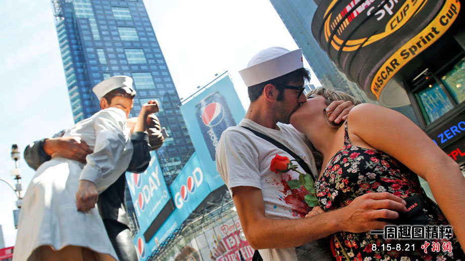 來自不同國家、不同種族的200多對(duì)情侶,14日齊聚紐約時(shí)報(bào)廣場,再現(xiàn)“勝利日之吻”的經(jīng)典瞬間,以此紀(jì)念二戰(zhàn)結(jié)束65周年。