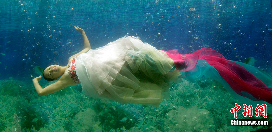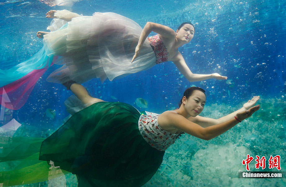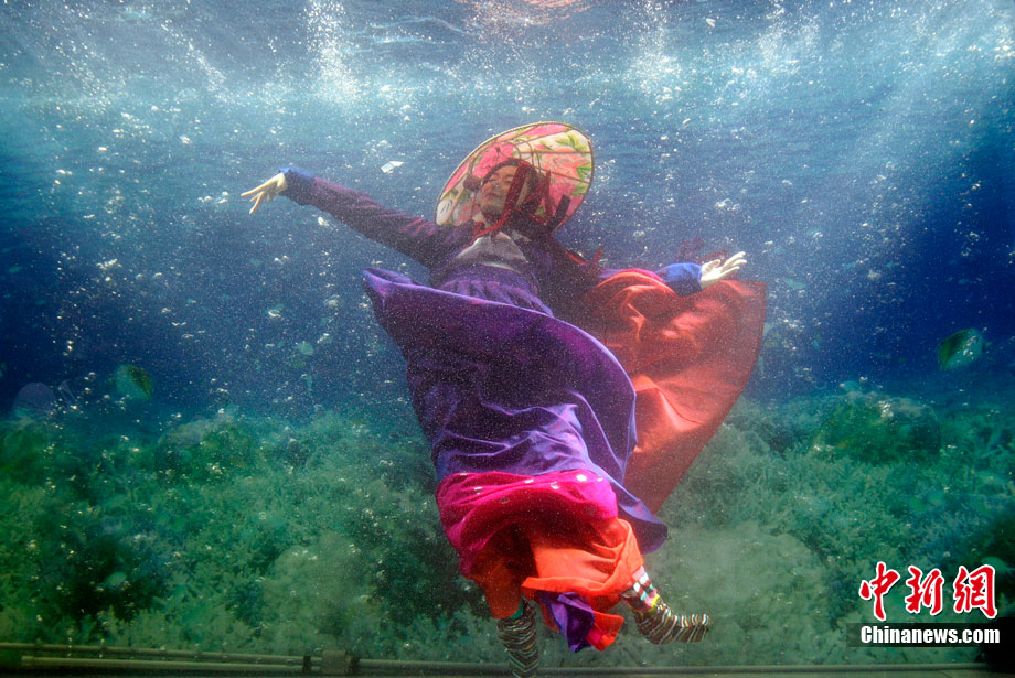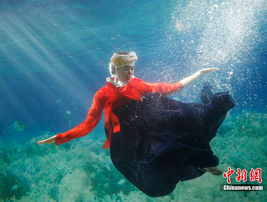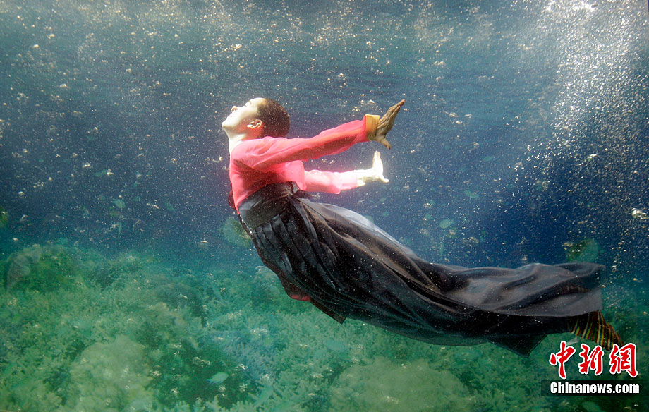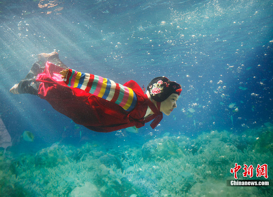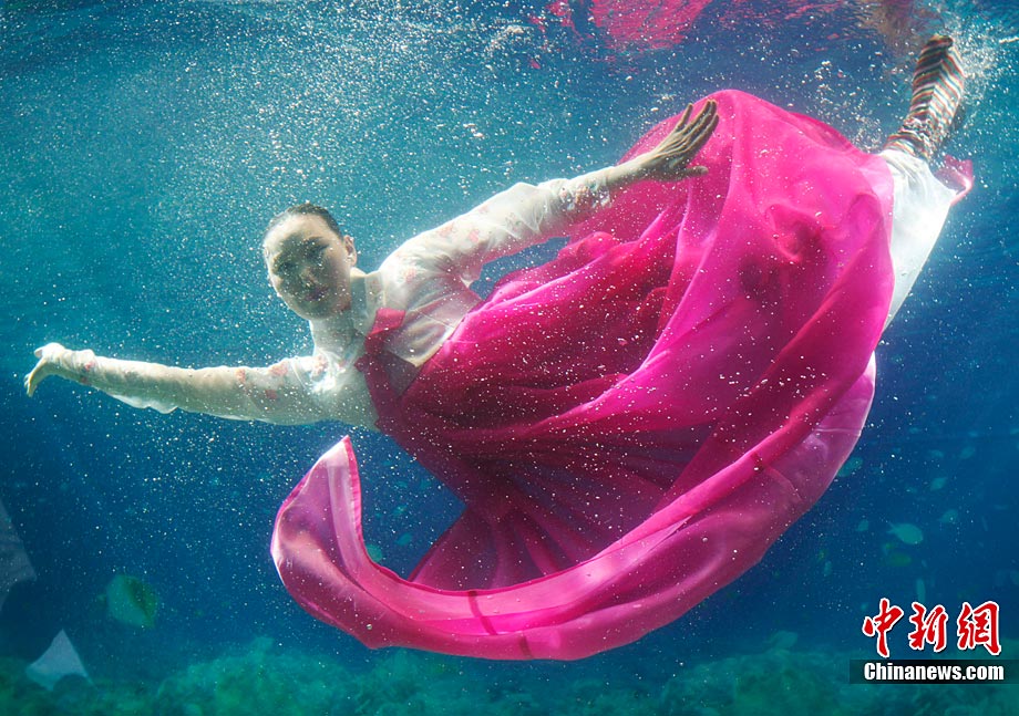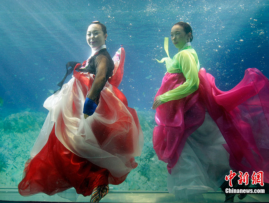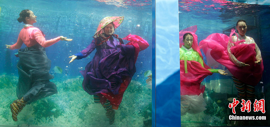 當?shù)貢r間8月22日,在韓國首都首爾舉辦的一場名為“水下韓服秀”的推廣活動中,多名身著韓服的潛水員在水族箱中為觀眾表演。