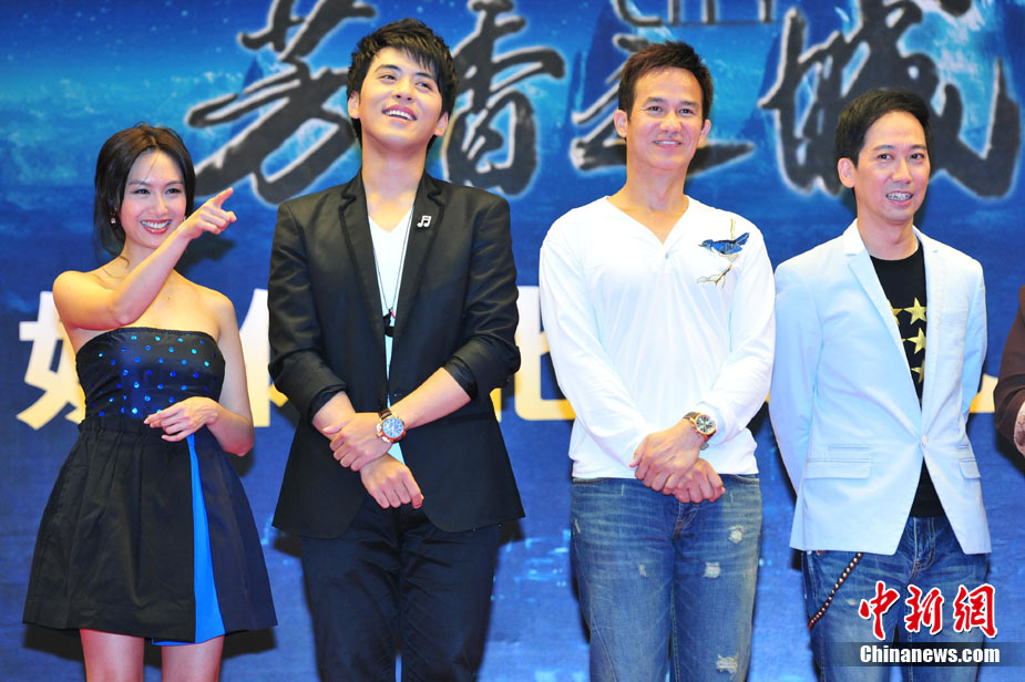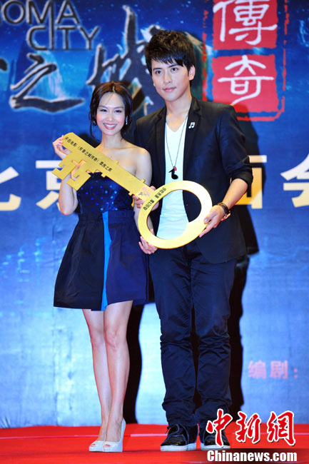8月25日,電影《芳香之城傳奇》在北京舉行記者會。不老的“紫霞仙子”朱茵攜主演扎西頓珠、張達明、李子雄、張璇、董立范等亮相。朱茵以一襲抹胸短裙亮相,自曝在新片中大轉型,飾演一個有天然體香的神秘啞女,男主角扎西頓珠飾演的“富二代”被其吸引后,上演了一段純美姐弟戀。朱茵在接受采訪時坦言自己并不拒絕姐弟戀。圖為朱茵、扎西頓珠現(xiàn)場秀親昵。中新社記者 李學仕 攝