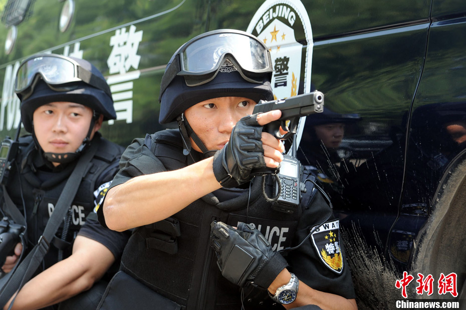 近日,北京警方在奧體中心體育館、北京科技大學(xué)體育館等4個(gè)場(chǎng)館和4個(gè)住地同時(shí)舉行多警種綜合演練,通過演練檢驗(yàn)實(shí)戰(zhàn)效果和處突技能。根據(jù)預(yù)先制定的67個(gè)工作方案,有近11個(gè)警種在前期結(jié)合職責(zé)分工進(jìn)行了單警種演練。本月27日起,涉及比賽和訓(xùn)練的所有場(chǎng)館和住地將實(shí)行24小時(shí)封閉守護(hù),北京警方將采取各種科技手段,確保首屆武搏會(huì)安全順利舉辦。中新社發(fā) 李連杰 攝