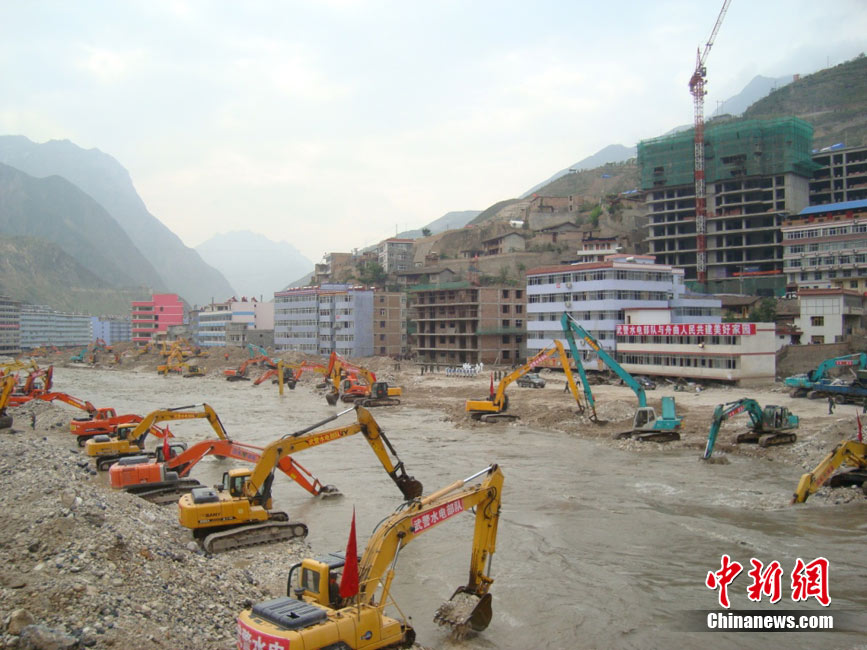 8月30日,舟曲白龍江堰塞湖應(yīng)急排險(xiǎn)和河道應(yīng)急疏通任務(wù),比預(yù)定時(shí)間提前12小時(shí)全面完成。這是解放軍副總參謀長章沁生30日15時(shí)在舟曲白龍江城江橋頭召開的新聞發(fā)布會上,向社會公布的。章沁生在發(fā)布會上說,到30日12時(shí),城江橋至城關(guān)橋段水位已回落至省道313線最低點(diǎn),城區(qū)積水全部回流歸槽,標(biāo)志著舟曲白龍江堰塞湖應(yīng)急排險(xiǎn)和河道應(yīng)急疏通任務(wù)全面完成。舟曲特大山洪泥石流災(zāi)害發(fā)生后,導(dǎo)致白龍江形成堰塞湖致使江水水位暴漲,舟曲縣城三分之一街區(qū)被淹。武警水電部隊(duì)、蘭州軍區(qū)工程兵某部每天出動上千官兵,大型機(jī)械百余臺,先是排除了堰塞湖潰決險(xiǎn)情,從13日轉(zhuǎn)入河道應(yīng)急疏通任務(wù),24小時(shí)持續(xù)奮戰(zhàn),終于提前完成了這一艱巨任務(wù)。圖為在舟曲縣城江橋上游河段,解放軍和武警部隊(duì)晝夜不停對河道進(jìn)行除險(xiǎn)清淤。 中新社發(fā) 郭海勇 攝