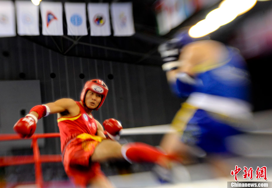 8月31日,2010年北京首屆世界武搏運動會泰拳比賽在北京奧體中心體育館進行了11個級別半決賽的較量,包括8個級別的男子半決賽和3個級別的女子半決賽。 中新社發(fā) 盛佳鵬 攝
