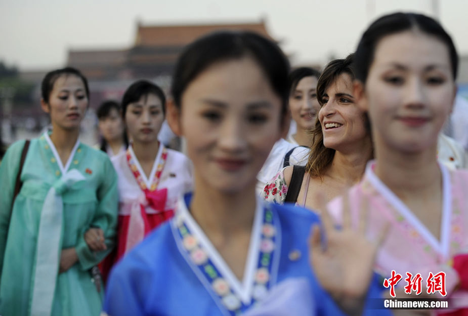 9月1日,朝鮮平壤藝術(shù)團(tuán)的藝術(shù)家參觀天安門廣場。當(dāng)日,朝鮮平壤藝術(shù)團(tuán)在中國全國的巡演活動正式啟動,平壤藝術(shù)團(tuán)將在上海世博、寧波、廣州、深圳、珠海、昆明、重慶、武漢等20多個(gè)城市巡演“怒放的金達(dá)萊”。中新社記者 廖攀 攝