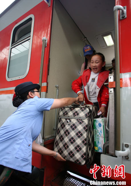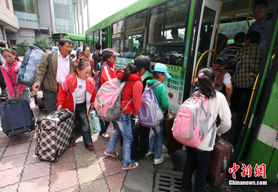 9月6日中午,青海省玉樹州地震災(zāi)區(qū)民族中學(xué)2013級(jí)初一、高一486名新生經(jīng)過長(zhǎng)途跋涉安全抵達(dá)成都,他們將在四川都江堰八一聚源中學(xué)異地過渡。至此,玉樹州民族中學(xué)成建制轉(zhuǎn)移安置工作全部結(jié)束。圖為玉樹州民族中學(xué)新生抵達(dá)成都火車站。 中新社發(fā) 劉忠俊 攝