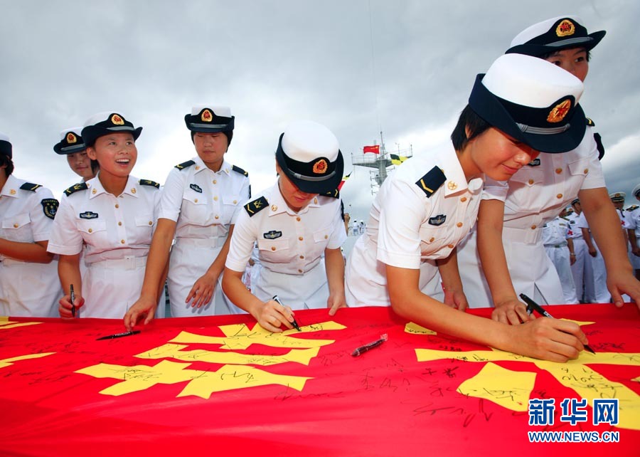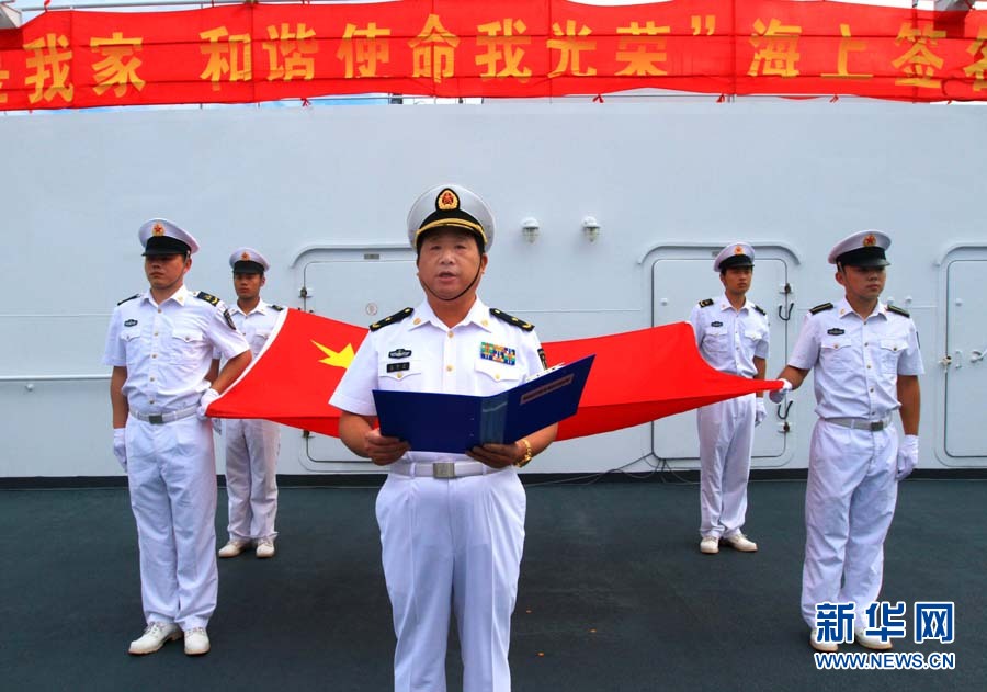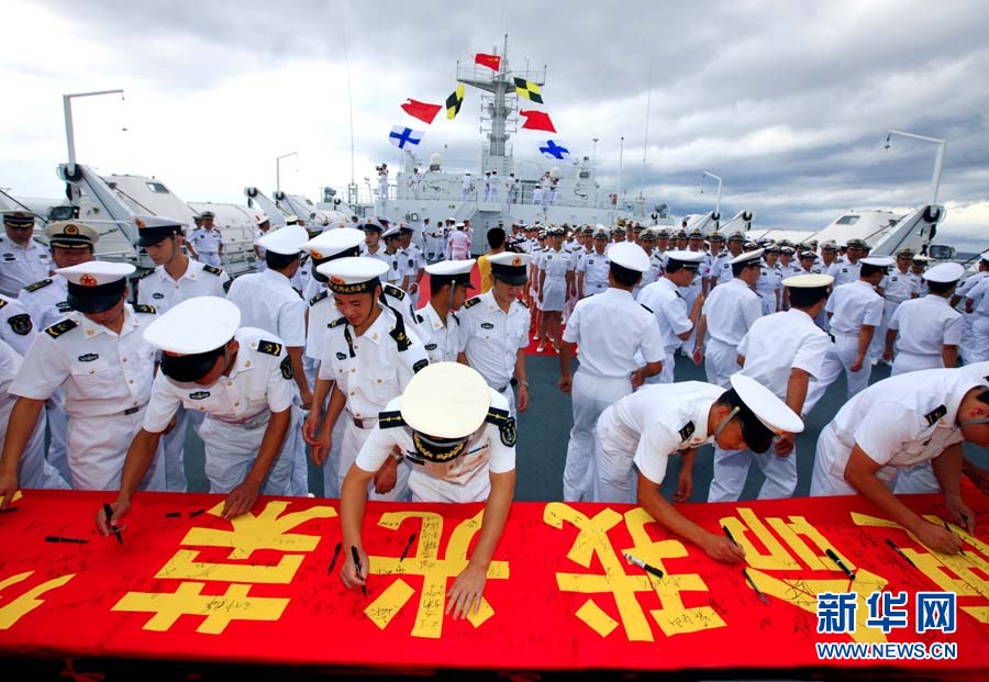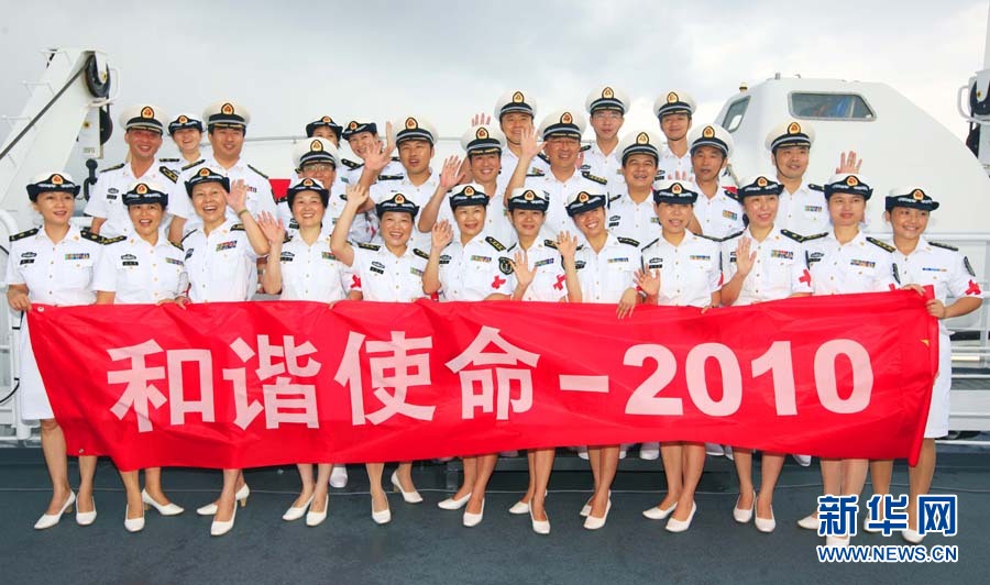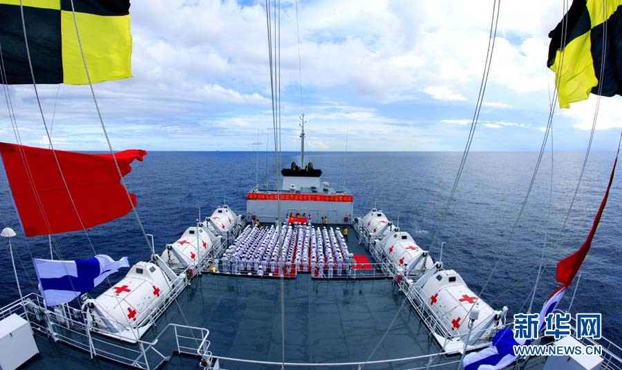 9月6日,“和平方舟”號醫(yī)院船舉行宣誓儀式。當(dāng)日,經(jīng)過連續(xù)多天的航行,前往亞丁灣海域及吉布提等亞非五國執(zhí)行“和諧使命—2010”任務(wù)的中國“和平方舟”號醫(yī)院船駛出國門。這是“和平方舟”號醫(yī)院船首次穿越南海駛向大洋。428名官兵及醫(yī)務(wù)人員全程參加這次為期87天的任務(wù),總航程將達(dá)1.5萬多海里。自8月31日駛離舟山碼頭后,醫(yī)院船經(jīng)受了“獅子山”“圓規(guī)”“南川”臺風(fēng)的考驗,穿越臺灣海峽、西沙群島和南沙群島,順利抵達(dá)南海。查春明 攝 圖片來源:新華網(wǎng)
